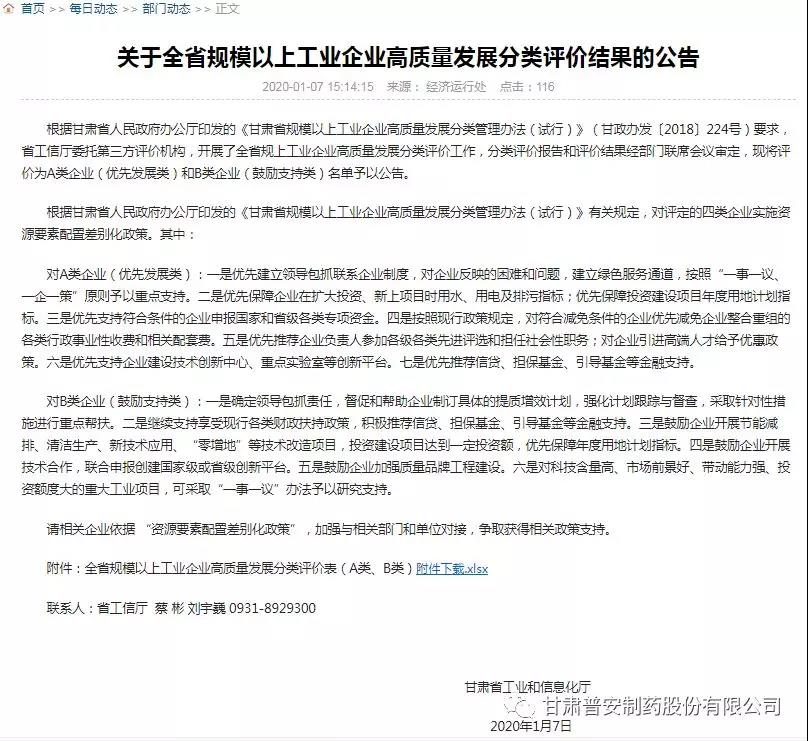 1月7日,根據甘肅省工業和信息化廳發布的“關于全省規模以上工業企業高質量發展分類評價結果”的公示,普安股份被評為全省規模以上工業企業高質量發展A類(優先發展類)企業,位列醫藥行業前三。此次分類評價工作經專業第三方評價機構評審,分類評價報告和評價結果經部門聯席會議審定,最終確定企業分類評價結果。普安股份將依據 “資源要素配置差別化政策”對A類企業的規定,加強與相關部門和單位對接,爭取獲得相關政策支持。