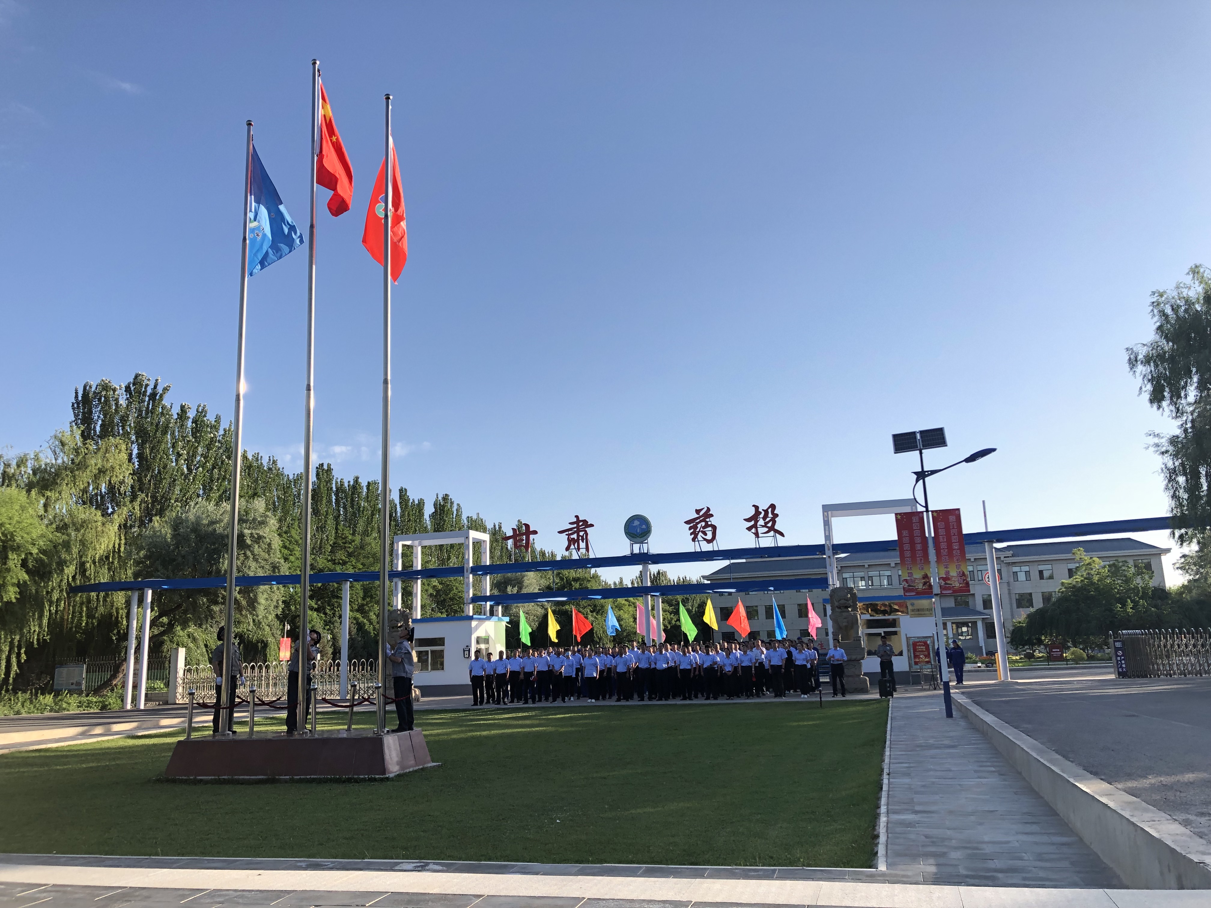7月1日早7點15分,迎著初升的朝陽,甘肅普安制藥股份有限公司在廠區大門口前舉行了升國旗與重溫入黨誓詞儀式。