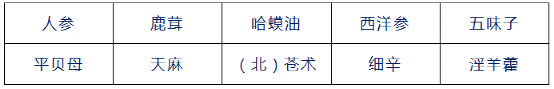 剌五加、五味子、人參、西洋參、漢麻(火麻仁)、關防風、赤芍、板藍根、鹿茸