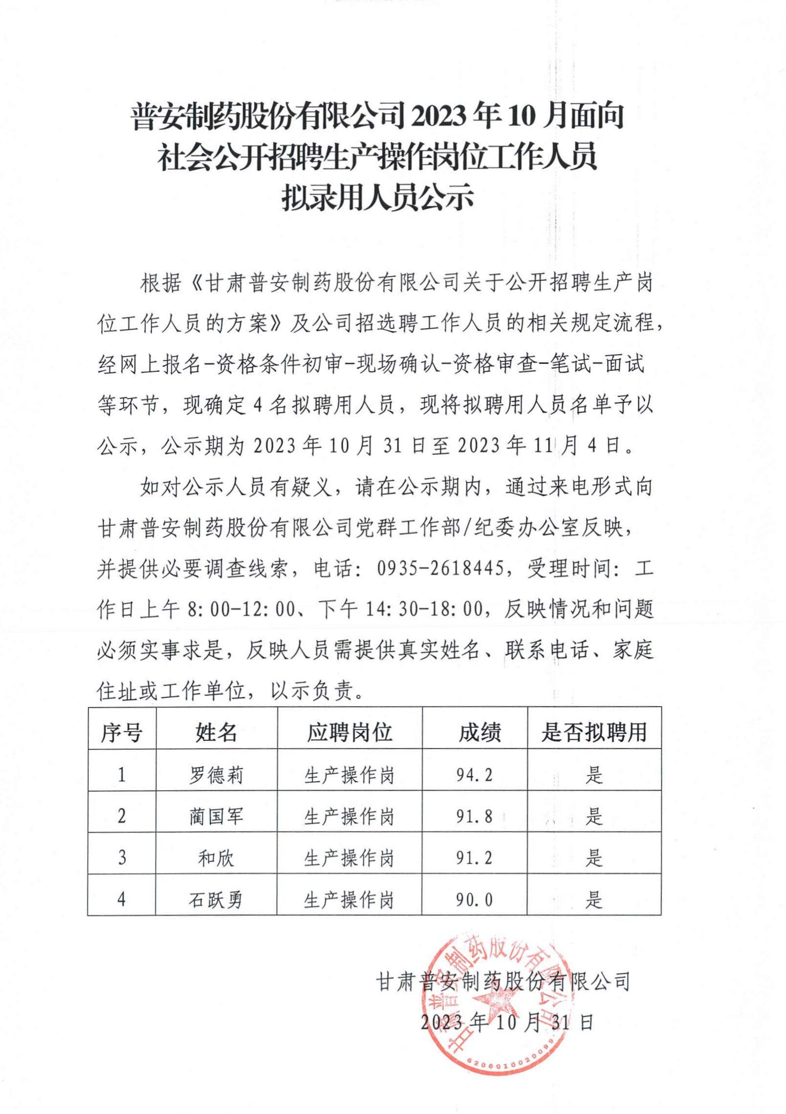 普安制藥股份有限公司2023年10月面向 社會公開招聘生產操作崗位工作人員擬錄用人員公示