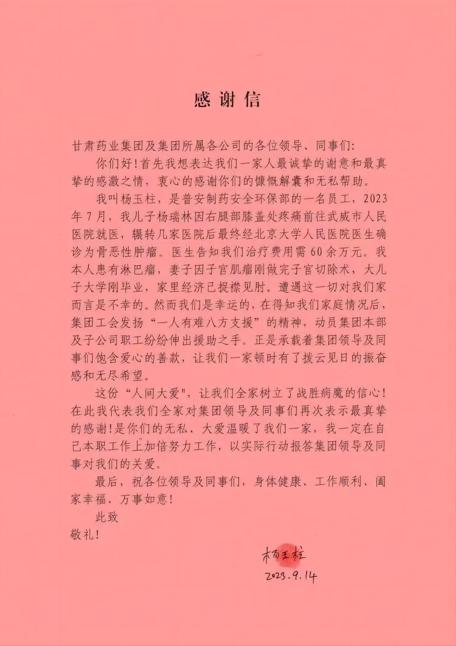 楊玉柱同志是普安公司的老職工,2019年經診治患有淋巴瘤,先后在武威市人民醫院、蘭大二院進行治療,病情剛剛趨于穩定,以為苦盡甘來之際,厄運卻再次降臨在楊師傅的家庭,兒子楊瑞林于2023年7月被確診為骨惡性腫瘤,治療費用高達60余萬元,這讓本就經濟困難的一家人陷入困境。得知楊師傅一家的情況后,普安制藥工會多渠道尋求救助途徑,并在藥業集團及各所屬公司干部職工中發起了募捐倡議。募捐期間,全體干部職工們踴躍捐款,紛紛奉獻自己的愛心,為楊師傅一家募集了83044.01元的捐款。
