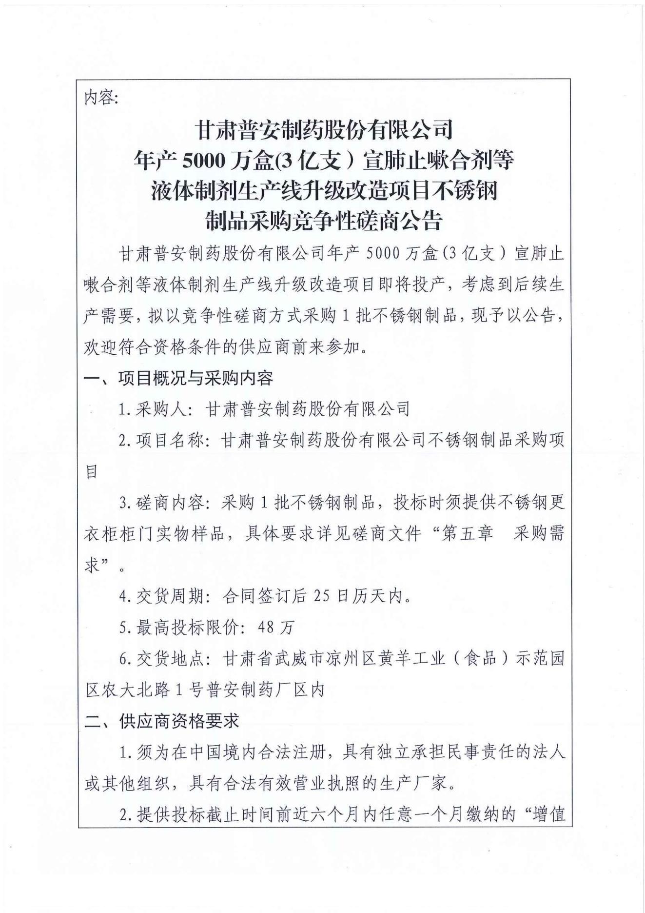 甘肅普安制藥股份有限公司年產(chǎn)5000 萬(wàn)盒(3億支)宣肺止嗽合劑等液體制劑生產(chǎn)線(xiàn)升級(jí)改造項(xiàng)目不銹鋼制品采購(gòu)競(jìng)爭(zhēng)性磋商公告