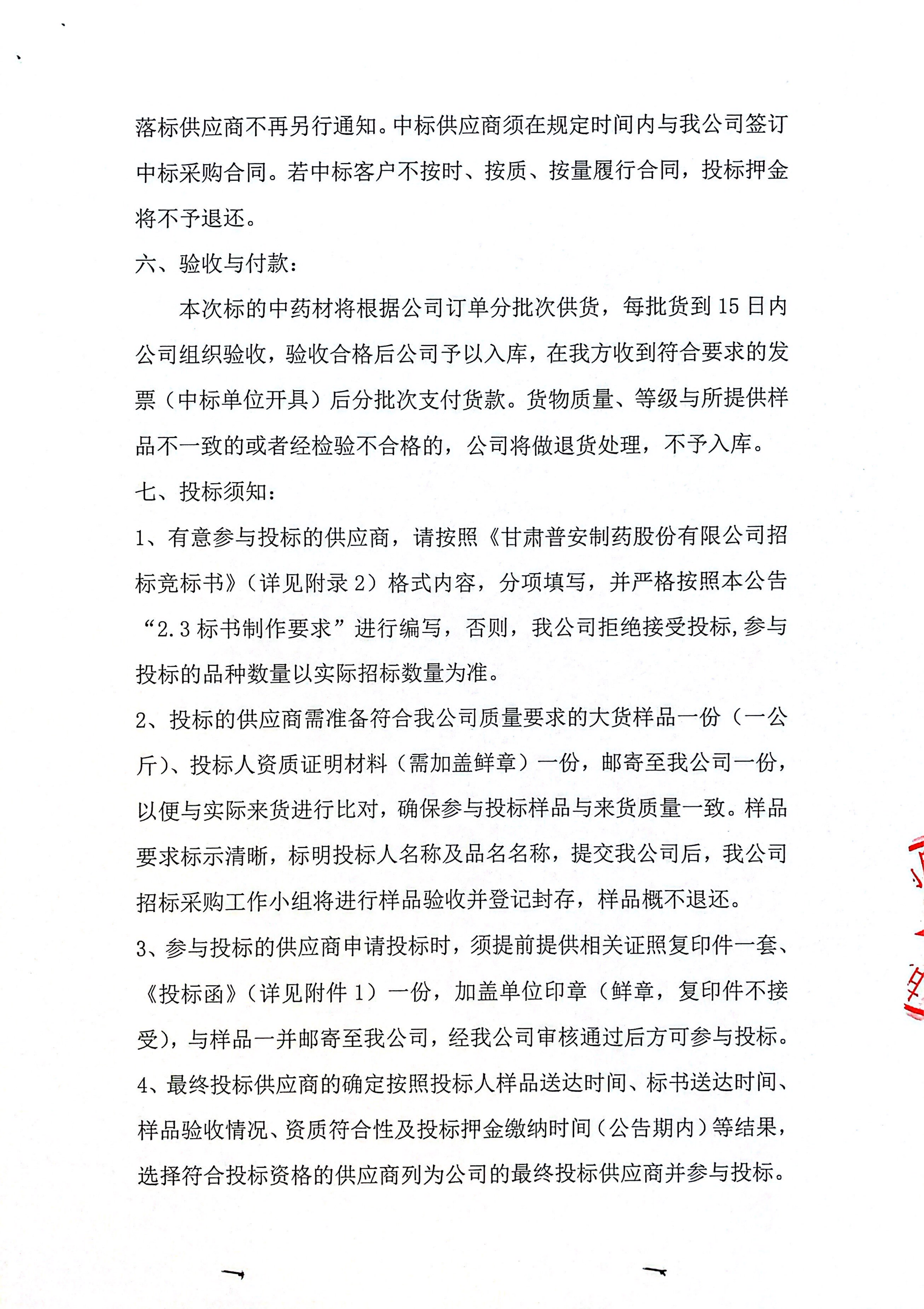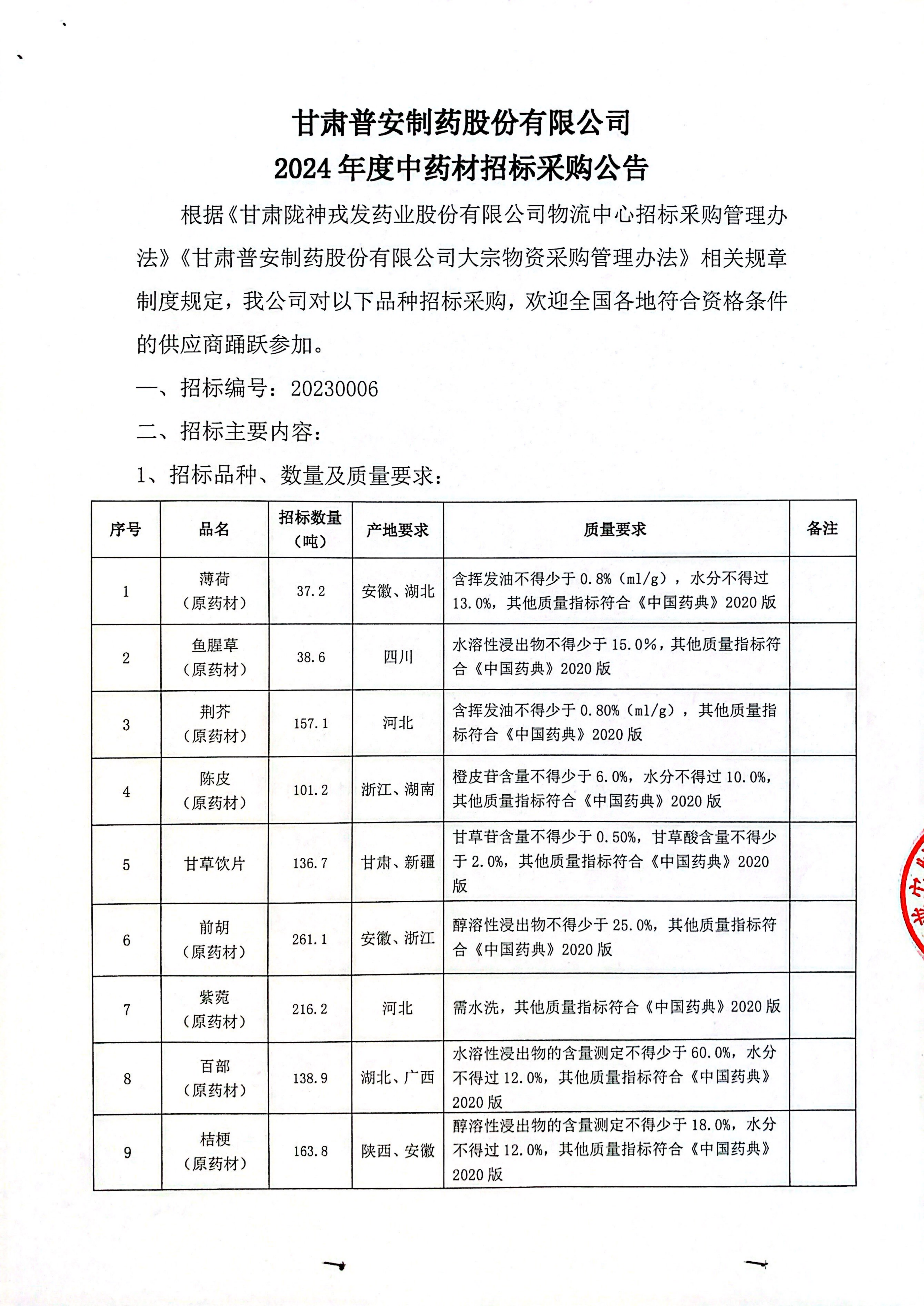 甘肅普安制藥股份有限公司2024年度中藥材招標采購公告