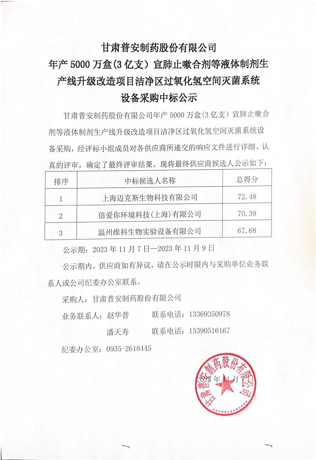 甘肅普安制藥股份有限公司年產5000萬盒(3億支)宣肺止嗽合劑等液體制劑生產線升級改造項目潔凈區過氧化氫空間滅菌系統設備采購中標公示