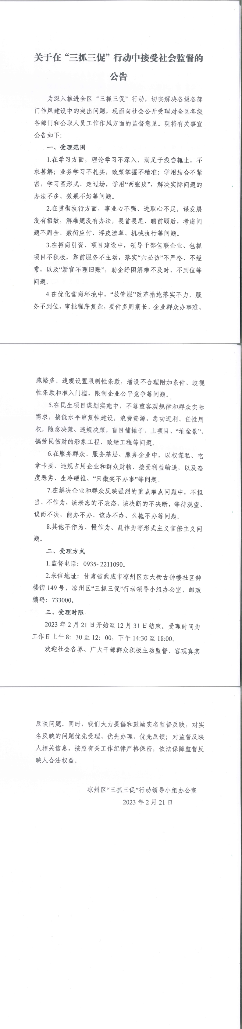 關(guān)于在“三抓三促”行動(dòng)中接受社會(huì)監(jiān)督的公告