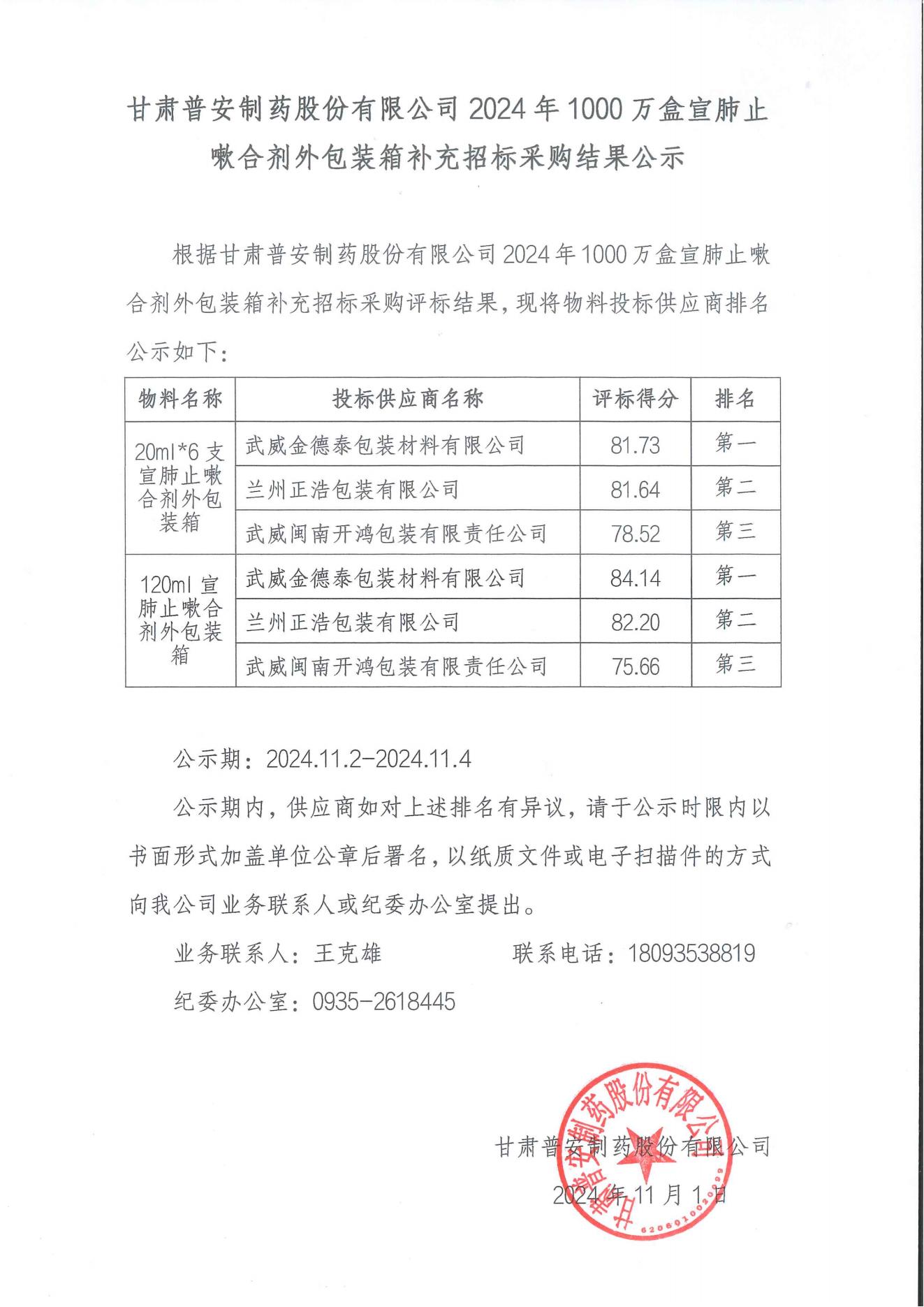 甘肅普安制藥股份有限公司2024年1000萬盒宣肺止嗽合劑外包裝箱補充招標采購結果公示