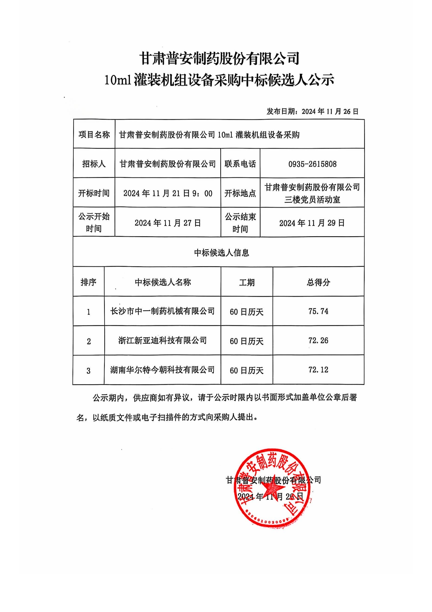 甘肅普安制藥股份有限公司10ml 灌裝機組設備采購中標候選人公示
