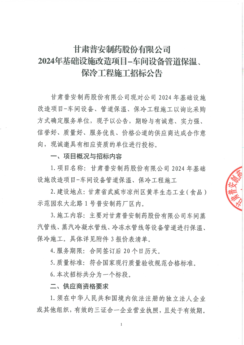 甘肅普安制藥股份有限公司2024年基礎(chǔ)設(shè)施改造項(xiàng)目-車間設(shè)備管道保溫、保冷工程施工招標(biāo)公告