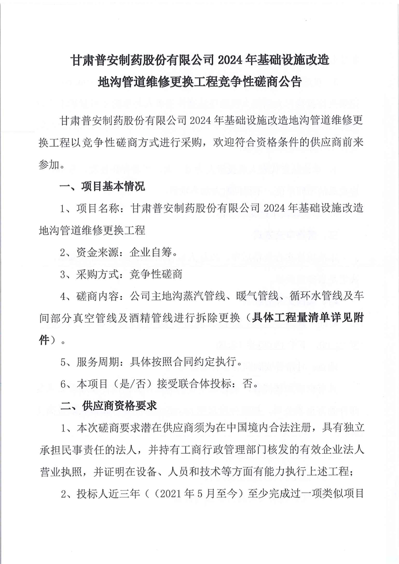 甘肅普安制藥股份有限公司2024年基礎設施改造地溝管道維修更換工程競爭性磋商公告