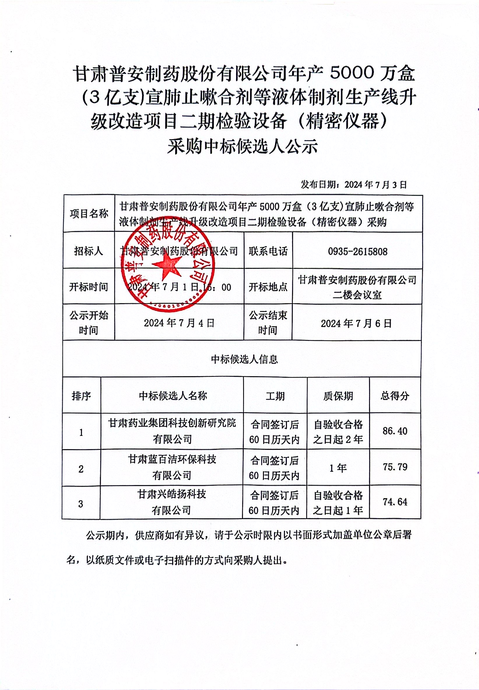 甘肅普安制藥股份有限公司年產5000萬盒(3億支)宣肺止嗽合劑等液體制劑生產線升級改造項目二期檢驗設備(精密儀器)采購中標候選人公示