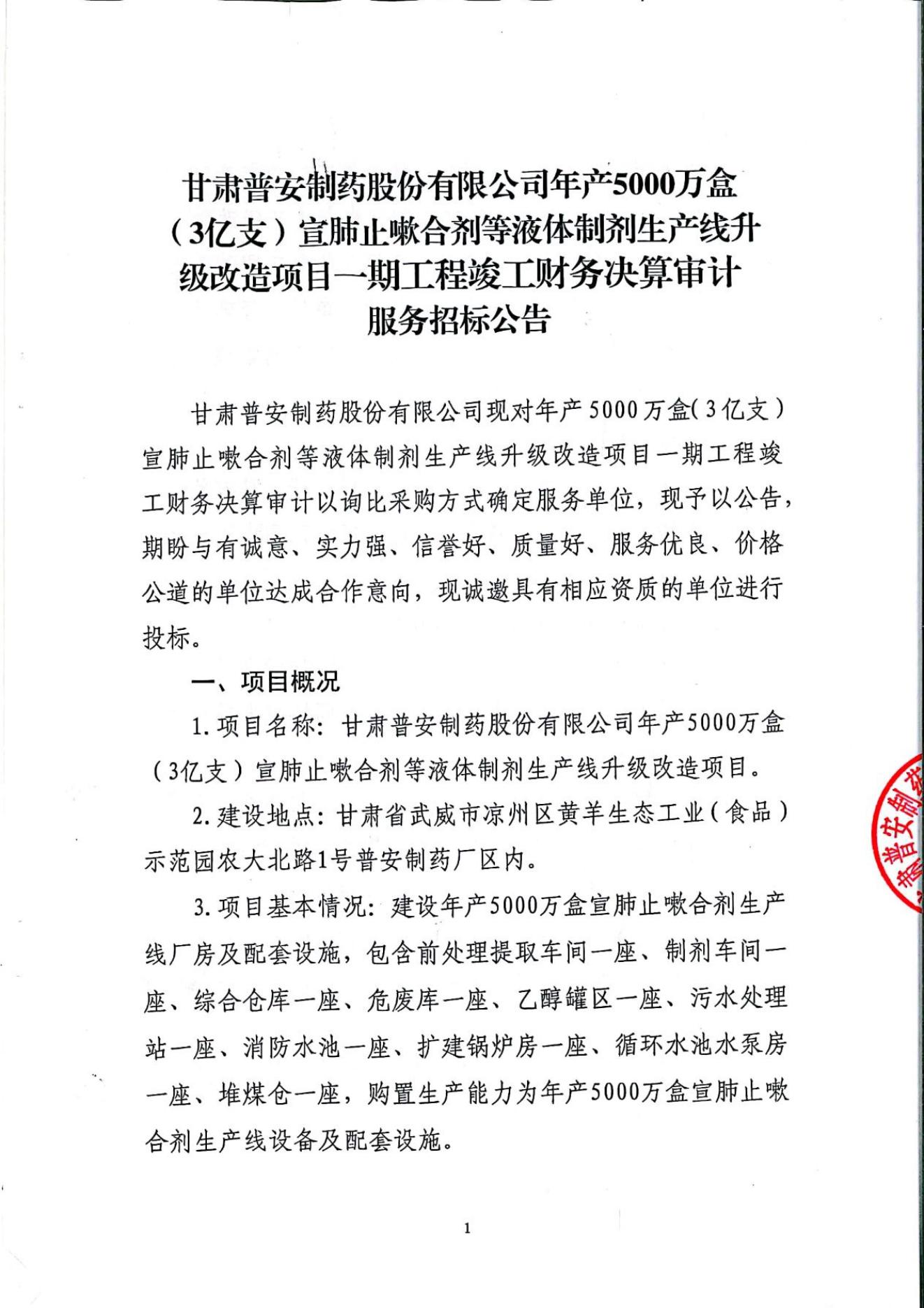 普安制藥年產(chǎn)5000萬盒宣肺止嗽合劑等液體制劑生產(chǎn)線升級改造項(xiàng)目一期竣工決算審計(jì)服務(wù)招標(biāo)公告